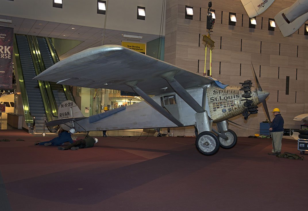 The Spirit of St. Louis, the plane which aviation legend Charles Lindbergh flew when he became the first man to fly solo nonstop across the Atlantic Ocean on May 21, 1927.  Charles Lindbergh made his final flight in the Spirit of St. Louis from St. Louis to Washington D.C. on April 30,1928 upon which he donated it to the Smithsonian.  The Spirit of St. Louis has just been lowered from the ceiling where it is displayed in the Boeing Milestones of Flight Hall at the National Air and Space Museum (NASM)  in Washington D.C. for routine maintenance.  Experts at NASM are going to be carrying out conservation work  on the fabric, and the engine, as well as assessing the condition of the Spirit of St. Luis is structurally to make sure that it will be able to preserved for future generations to enjoy.  While it is on the ground visitors to the National Air and Space Museum will have a unique up close look at a one of a kind piece of aviation history.